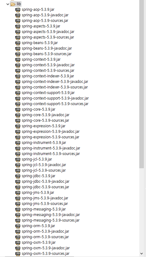 압축을 풀고 spring-framework-5.x.x > libs 로 들어가주자. 그러면 60몇 개의 jar이 있을 것이다.