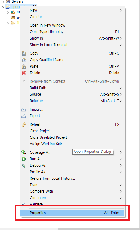 프로젝트를 우클릭하고 properties에 들어가준다.