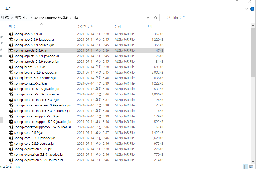 압축을 풀고 spring-framework-5.x.x > libs 로 들어가주자. 그러면 60몇 개의 jar이 있을 것이다.