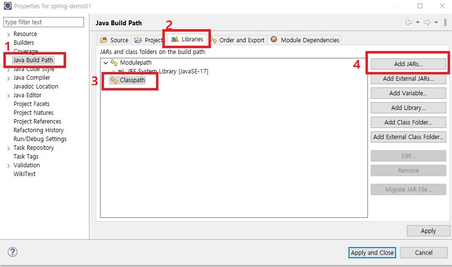 라이브러리에 스프링 프레임워크의 JAR파일을 넣어줘야한다.