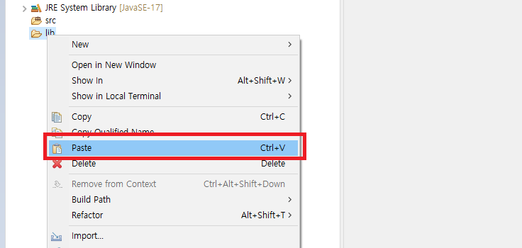 eclipse에서 자바 프로젝트에 lib파일을 만들어주고, lib에 모두 붙여넣기 해주자.