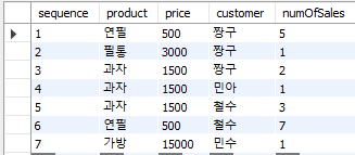 ("과자", 1500, "민아", 1),