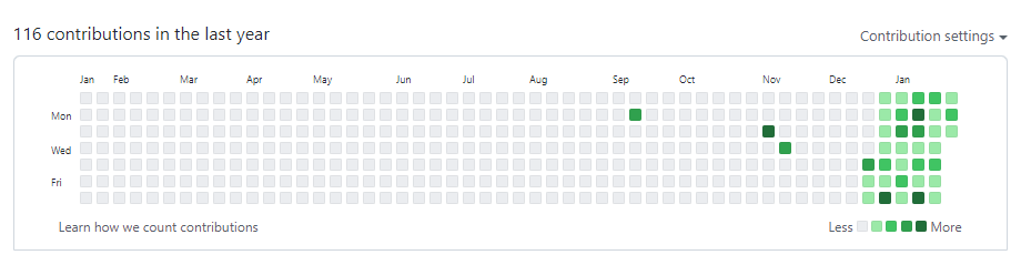2021년 12월 23일에 시작해서 지금(2022년 1월 25일)까지 34일간 하루도 빠짐없이 커밋을 진행했다.