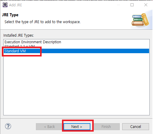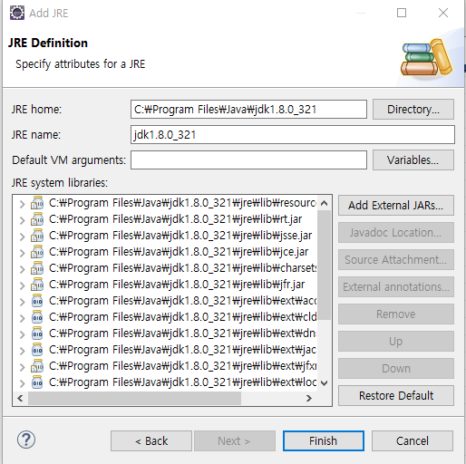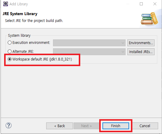 defalut 값으로 되어있는 JRE를 선택하고 Finish 버튼을 클릭한다.