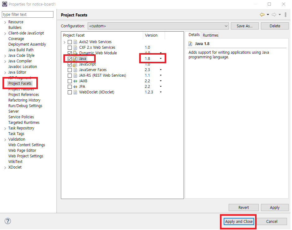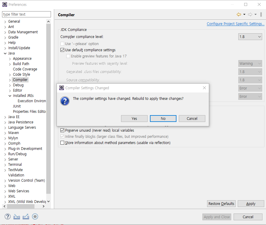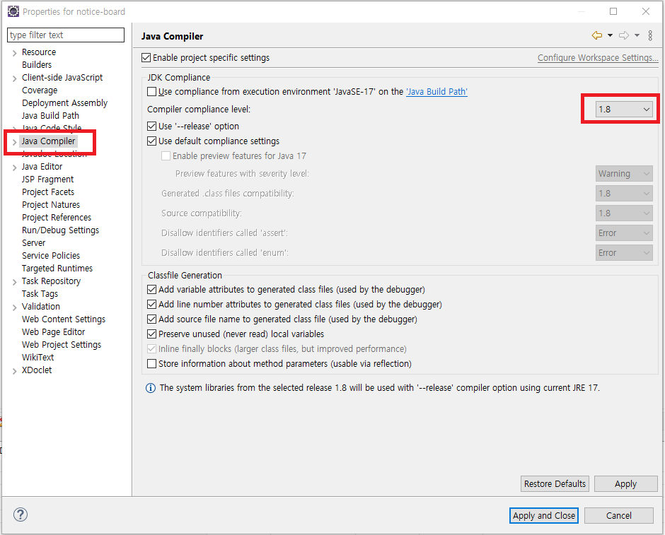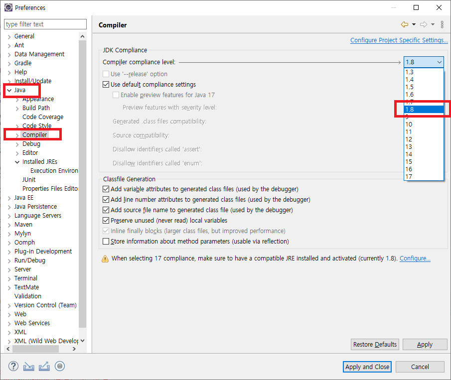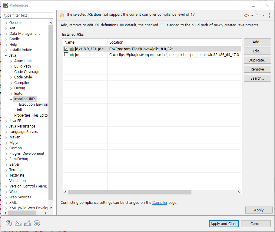 Java의 버전을 1.8로 바꿔주고 Apply and Close를 누르면 끝이 나게 된다.