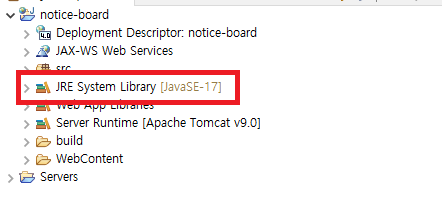 프로젝트의 JRE System Library의 오른쪽을 살펴보면 [JavaSE-17]이라고 되어있다.