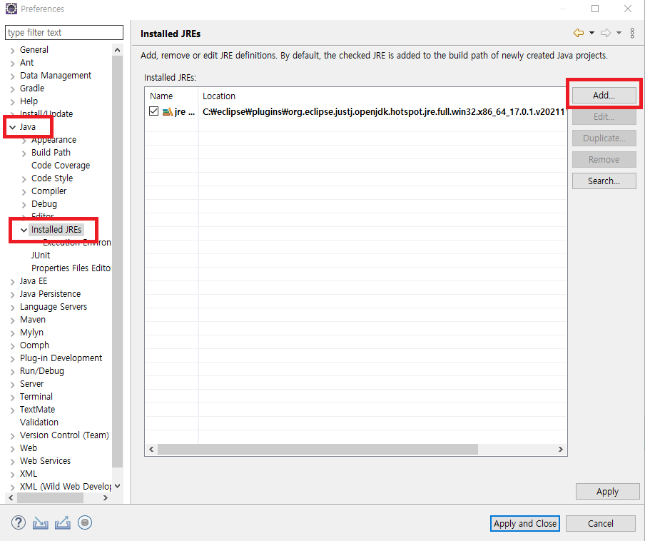 Java > Installed JREs 에 들어가면 Add 버튼이 있을 것이다. 클릭하자.