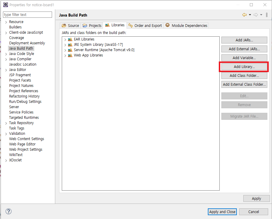 (선택사항) 기존에 존재하면 JRE System Library [JavaSE-17]를 클릭하고 Remove를 눌러 삭제한 다음