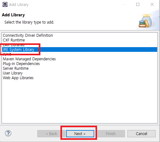 JRE System Library를 선택하고 Next버튼을 클릭한다.