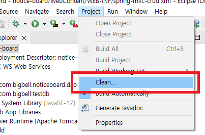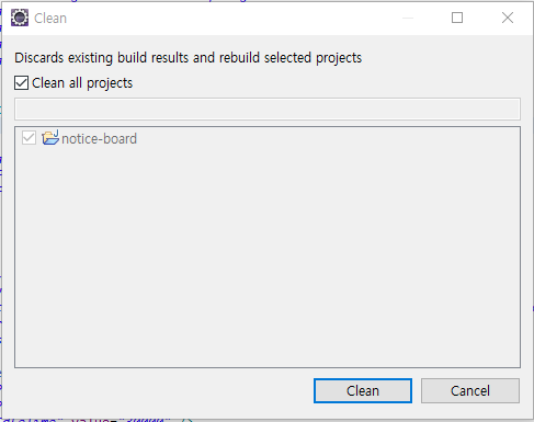 위의 메뉴판 Project > Clean 을 클릭하자.