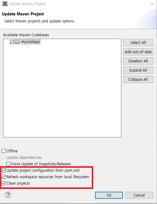 프로젝트를 우클릭 > Maven > Update Project 를 클릭한다.