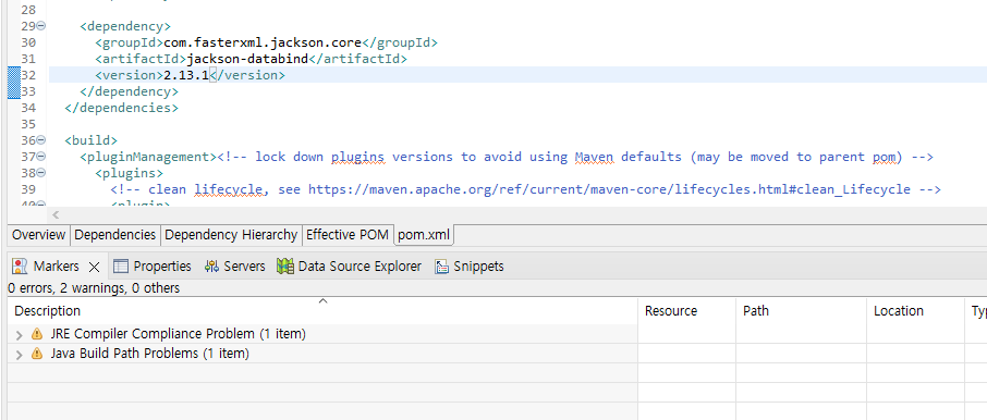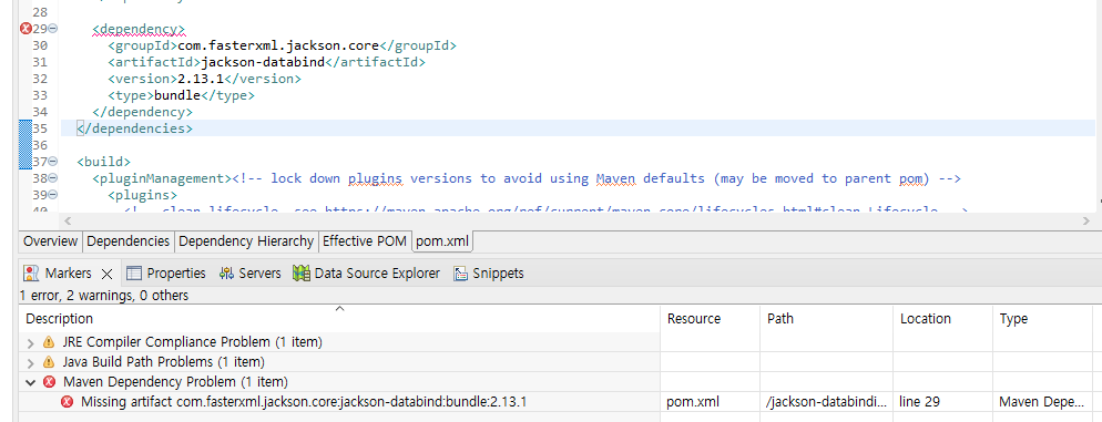 그대로 pom.xml에 갖다가 붙이면 Missing artifact com.fasterxml.jackson.core:jackson-databind:bundle:2.x.x 라는 오류 가 나타난다.