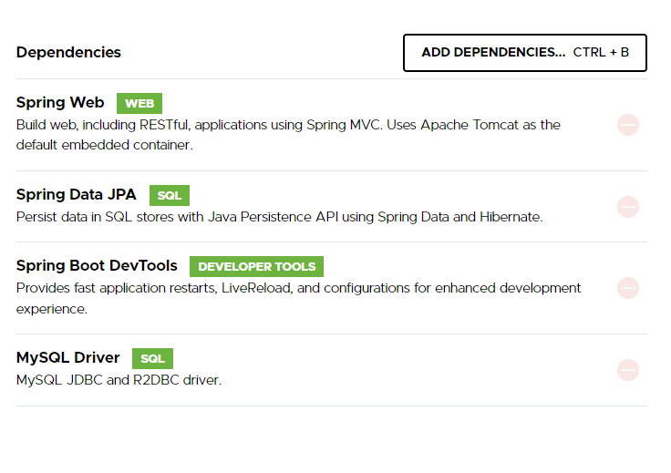 필요에 따라 mysql driver, JPA, DevTools 등을 추가하면 된다.