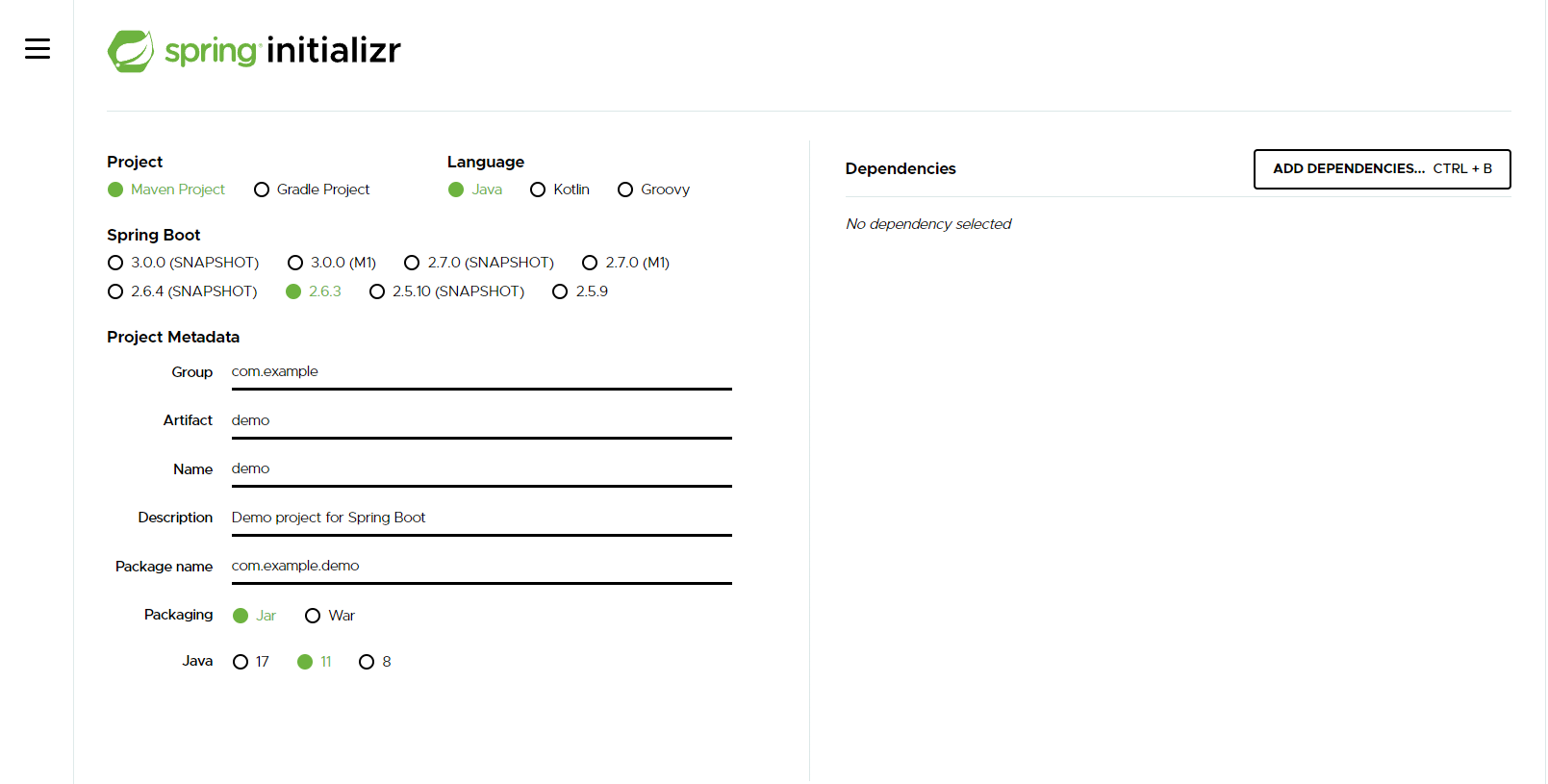 필요에 따라 mysql driver, JPA, DevTools 등을 추가하면 된다.