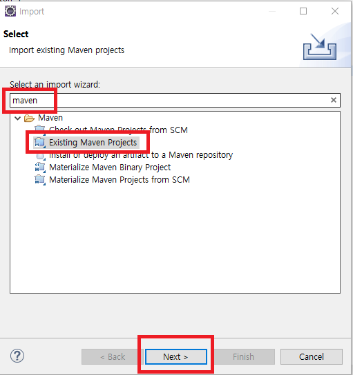 maven으로 검색하여 Exisiting Maven Projects를 선택하고 Next를 클릭하자.