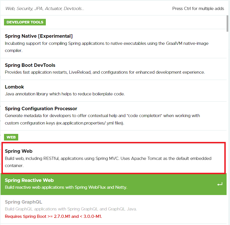 나는 웹 개발를 하기 위해 Spring Web을 선택하도록 하겠다.