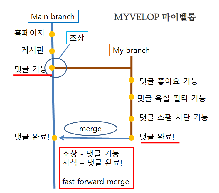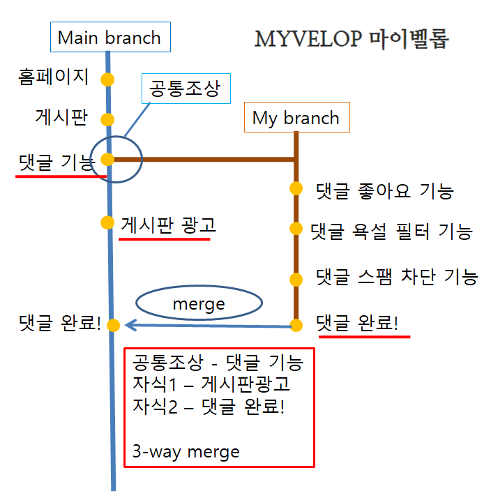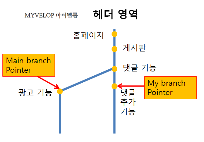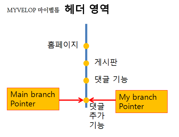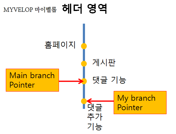 위 그림은 게시판까지는 main branch 포인터가 가리키고 있지만 댓글 기능부터는 My branch라는 새로운 브랜치 포인터가 생성되어 가리키고 있다.