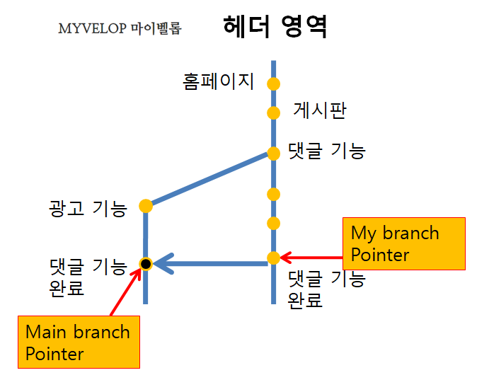 일단 전제는 위에서 보여준 예시와 같다. 게시판까지는 main branch 포인터, 댓글 기능부터는 My branch라는 새로운 브랜치 포인터가 만들어진 상태다.