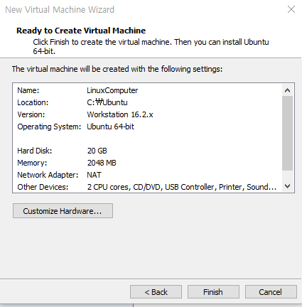 여기서 Finish를 누르면 가상머신을 만드는 과정은 끝이나게 된다.