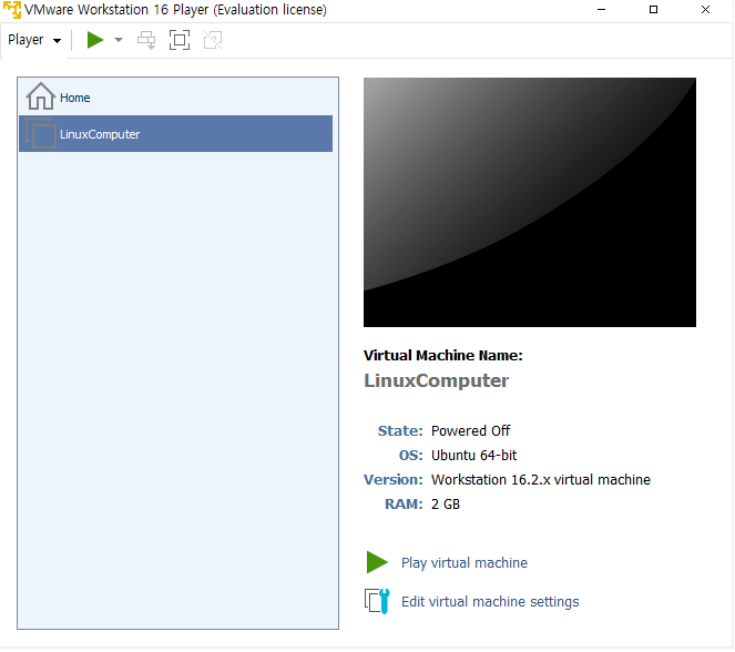 또한 컴퓨터 설정을 잘못했다면 Edit virtual machine settings 를 통해 가상으로 만들어진 컴퓨터 장치들을 손 봐줄 수도 있다.