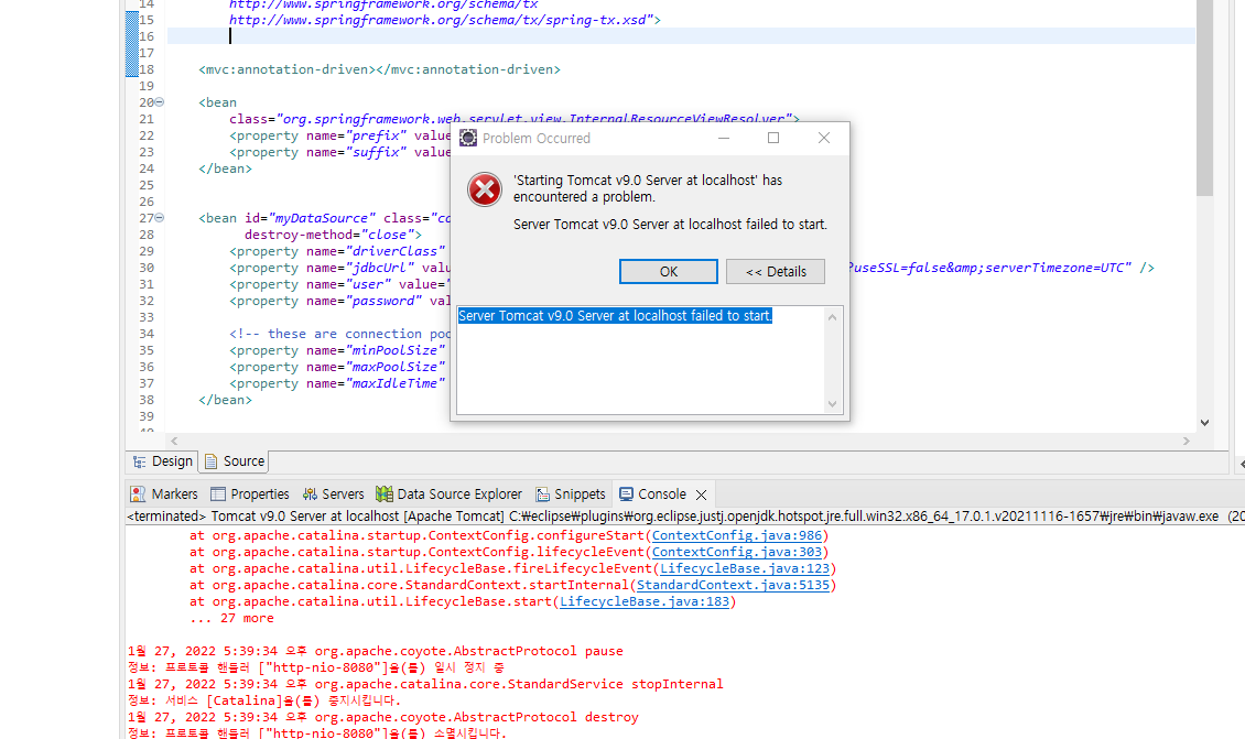 [오류해결]Server Tomcat v9.0 Server at localhost failed to start