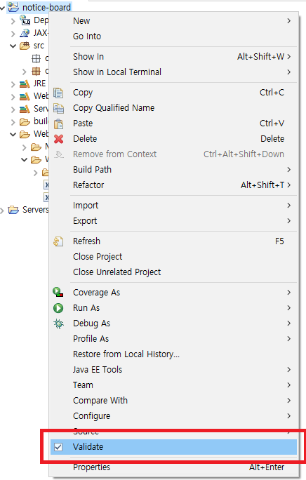프로젝트를 우클릭하면 Validate가 있을 것이다. 클릭해보자.
