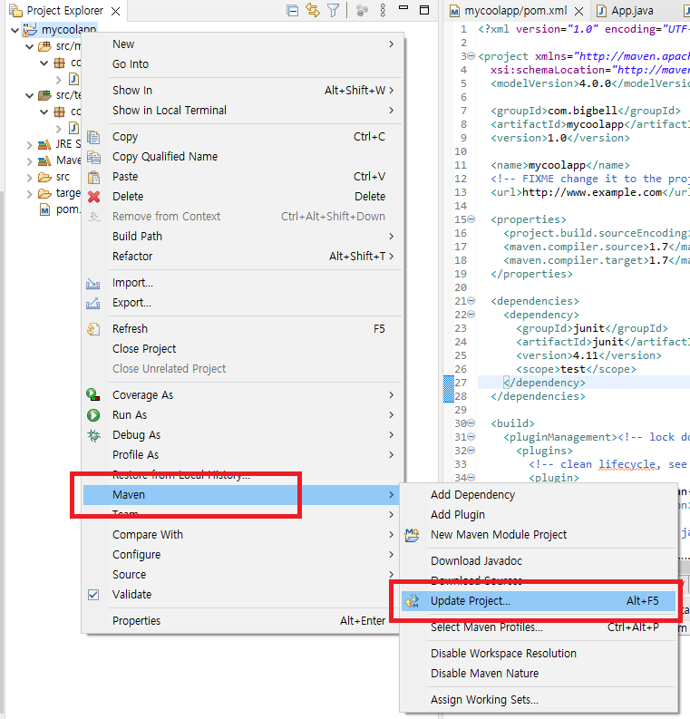 pom.xml의 내용을 바꾸었다면 프로젝트를 업데이트해주자