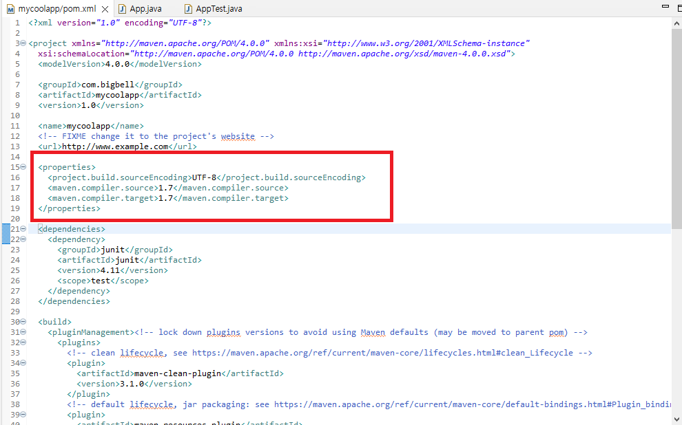 pom.xml을 확인해보면 위의 빨간박스로 되어있는 부분이 있을 것이다.