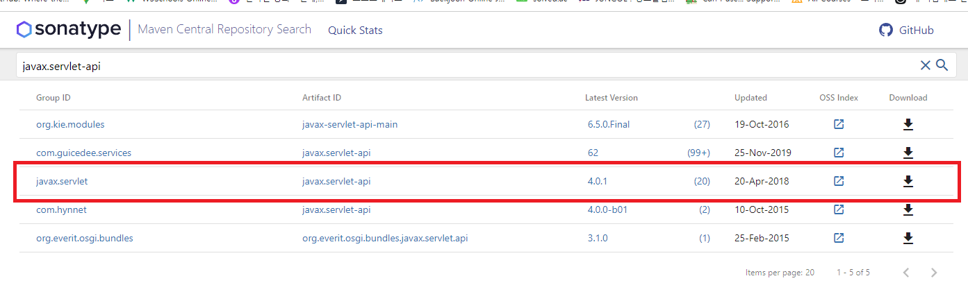 홈페이지에 접속해 javax.servlet-api 를 검색하자.