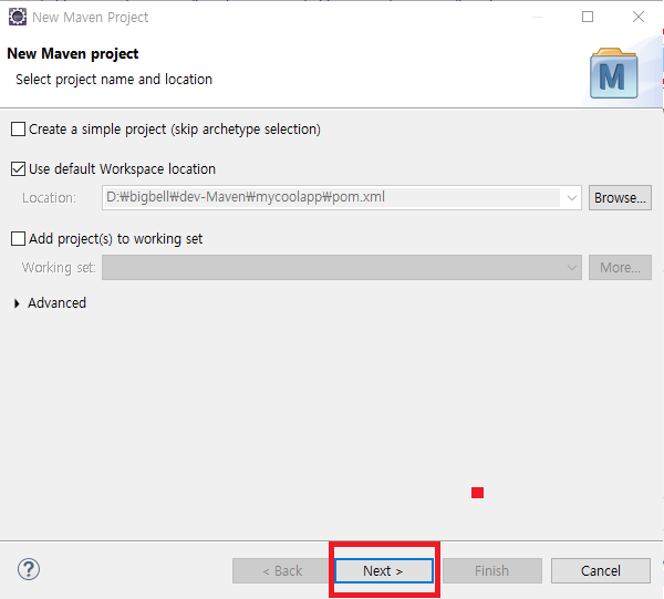 Use defalut Workspace location을 선택하고 Next를 클릭한다.